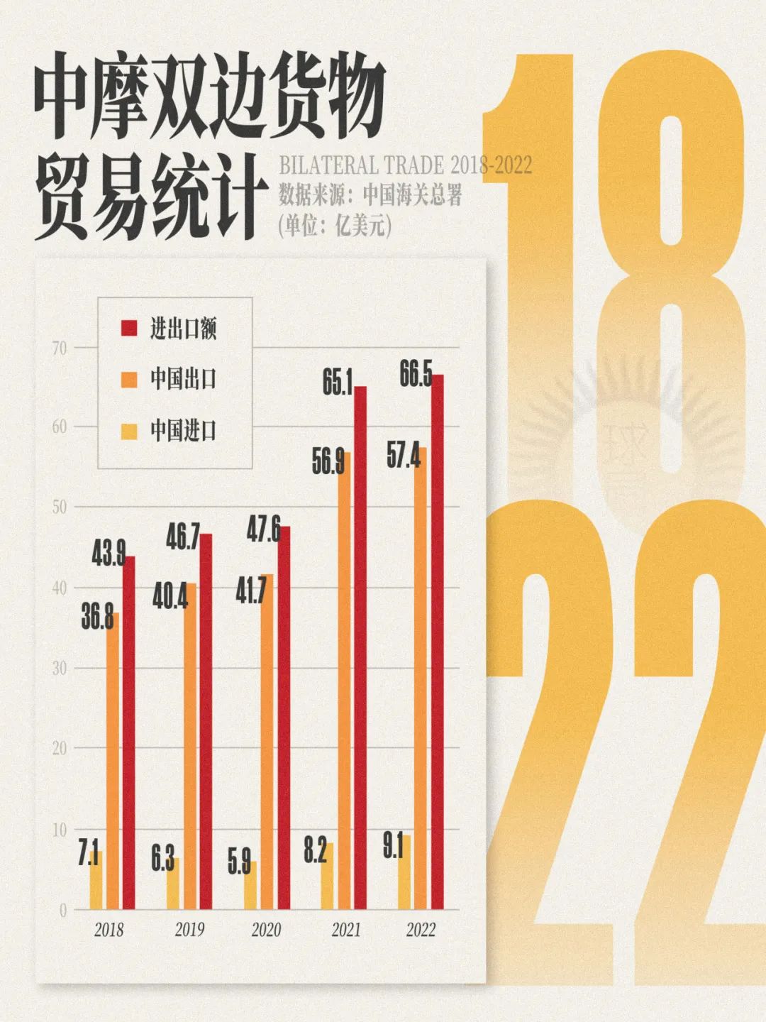 摩洛哥还积极融入“一带一路”倡议。2017年11月,中摩两国签署《共建“一带一路”谅解备忘录》。2022年1月,两国政府签署了《中华人民共和国政府与摩洛哥王国政府关于共同推进“一带一路”建设的合作规划》。