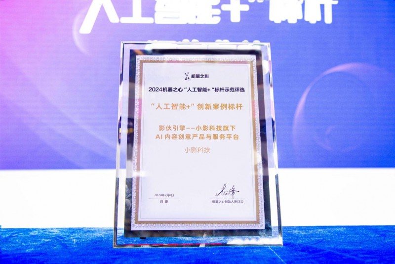 7月6日上午,由机器之心主办的“人工智能+”标杆颁奖典礼在世博展览馆举行,小影科技受邀出席,旗下影伙引擎——AI 内容创意产品与服务平台获评2024“人工智能 +”创新案例标杆。共同获评的还有度小满、格灵深瞳等企业,机器之心 CEO 赵云峰为获奖公司颁发奖项。