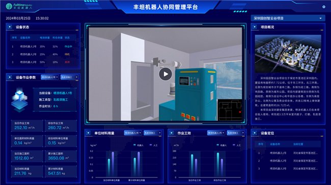 除发布三款建筑机器人外,针对施工现场多机器人作业管理难、信息割裂等难题,丰坦还发布了“机器人协同管理平台”,通过实时采集机器人位置、作业状态、电池余量、当日施工时长、施工面积、材料用量等现场数据,以可视化看板的形式呈现现场所有机器人的基础数据和运营数据,项目管理人员可及时了解机器人每日的综合工效,综合分析施工效率,打通智能建造的“最后一公里”。