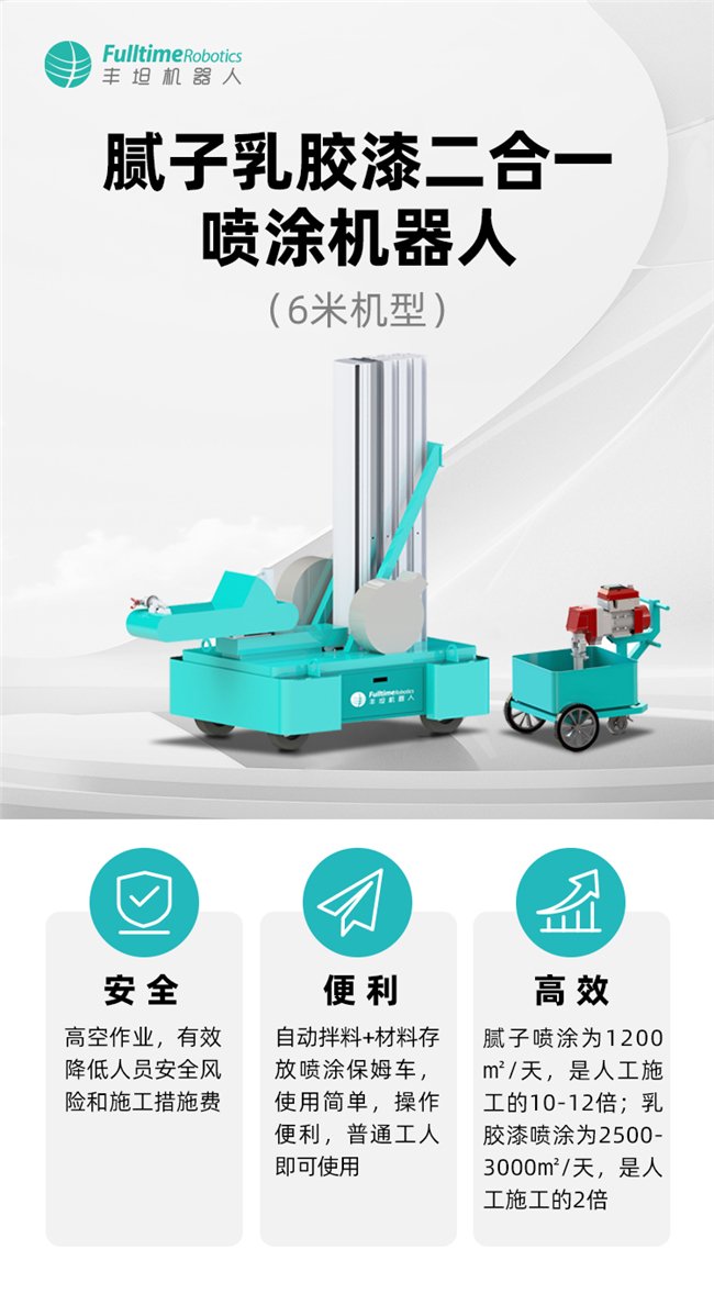 当前,丰坦已实现4.6米腻子乳胶漆喷涂机器人的商业化应用成功验证。此次新品的发布,将助力丰坦在室内涂料工程施工领域,实现从腻子喷涂、收刮、打磨、吸尘到乳胶漆喷涂的工序全覆盖;通过3.2米机型、4.6米机型、6米机型,实现场景全覆盖,进一步夯实丰坦机器人在涂料工程自动化施工“全工序、全场景”覆盖的业务定位。