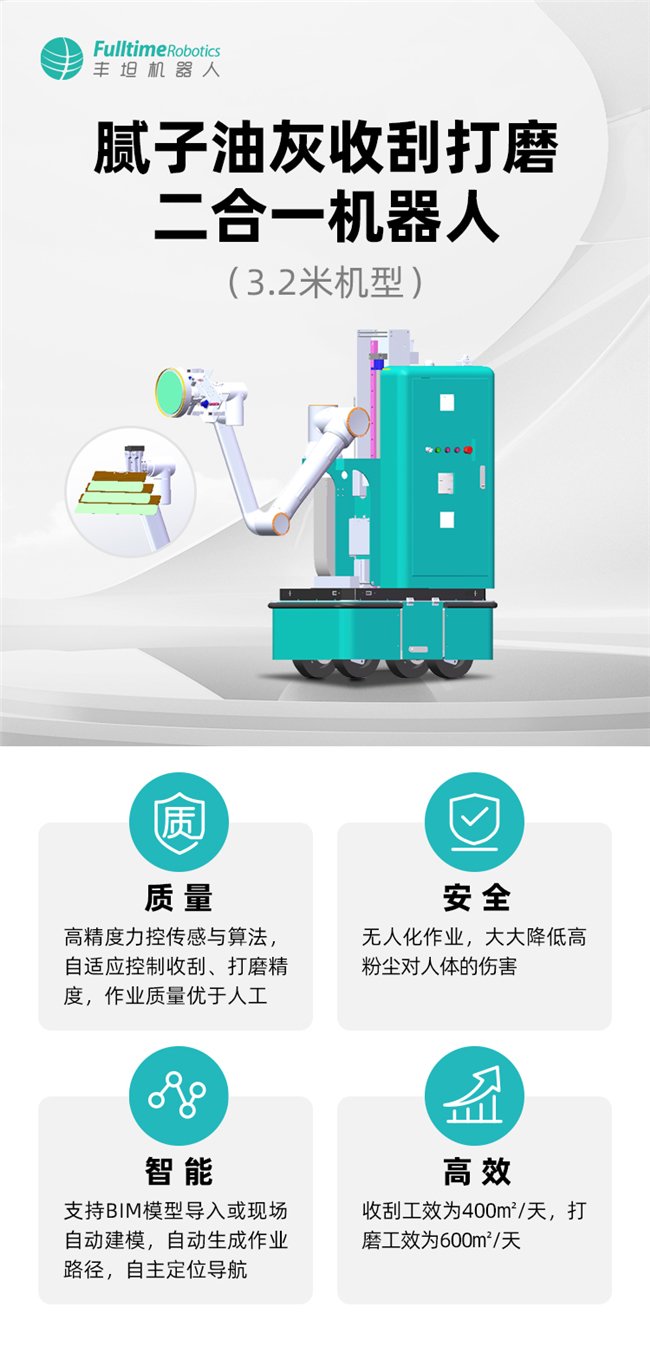腻子油灰收刮打磨二合一机器人(3.2米机型),是一款集腻子和油灰的收刮、打磨功能于一体的建筑机器人,广泛适用于商品房、保障房、宿舍、公寓等住宅类建筑装修。