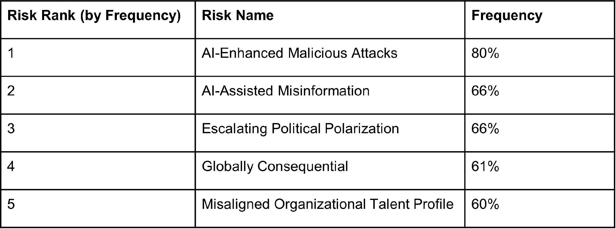 在2024年第一季度的调查中,与人工智能相关的风险占据了前两名,人工智能增强的恶意攻击被认为是最主要的新兴风险,人工智能辅助的错误信息也引起了关注。不断升级的政治两极分化是在2023年第四季度首次出现的,从第二大担忧降至第三位。