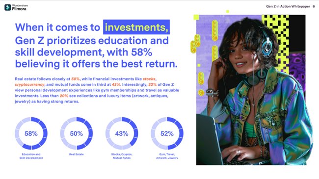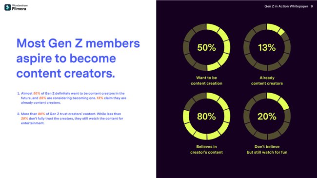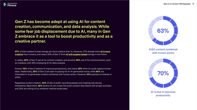 近日,AIGC软件A股上市公司万兴科技(300624.SZ)旗下视频创意软件Wondershare Filmora面向全球创作者发布《Z世代白皮书》(下称《白皮书》),基于对近千名北美Z世代人群的深入访谈,从内容创作、意见领袖(KOL)文化、人工智能等角度进行分析,揭示了这一代人对内容创作的热情与追求,并为理解Z世代在推动社会和行业发展中的潜力和作用提供了深刻的见解。