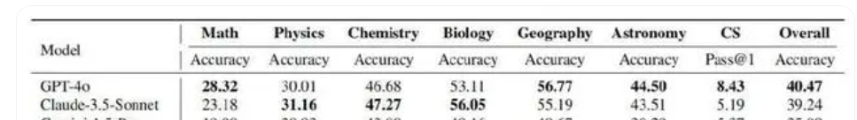 即使单纯聚焦到技术的单一维度,「最强模型」也同样是个伪命题。依旧是拿最新 Claude 3.5 与 GPT-4o 做横向参数对比,Claude-3.5-Sonnet 在物理、化学和生物学几项中超过了 GPT-4o,但是在数学、天文等科目中,则GPT-4o 更占优。