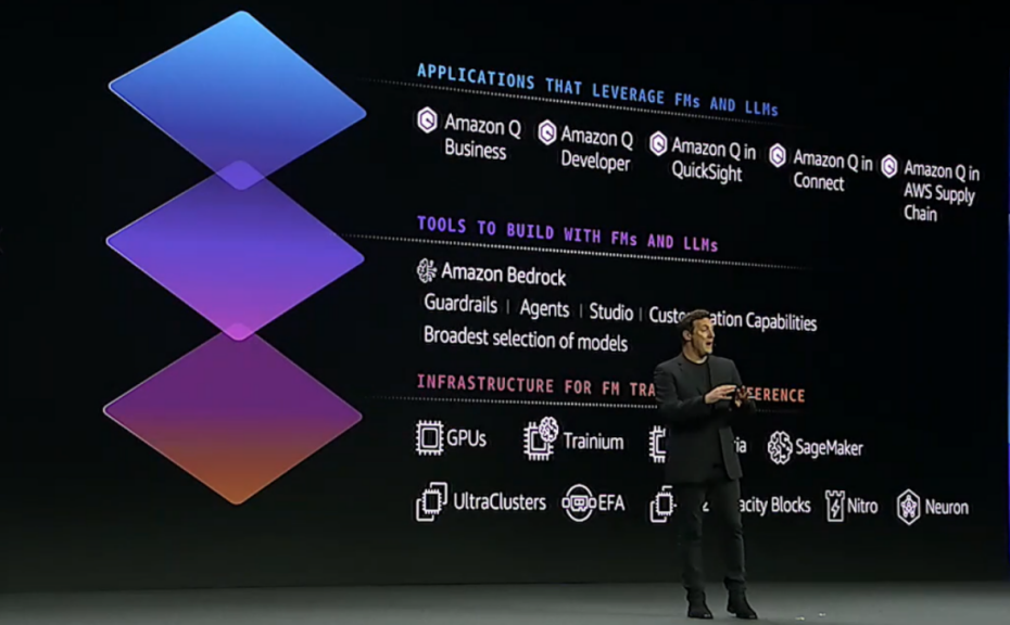 对内,亚马逊云科技的答案则可以结合其在过去一年中在基础设施算力层、工具层、AI 应用层三大维度的不断拼图补全,可以窥见亚马逊云科技对整个市场的认知与针对性解法。