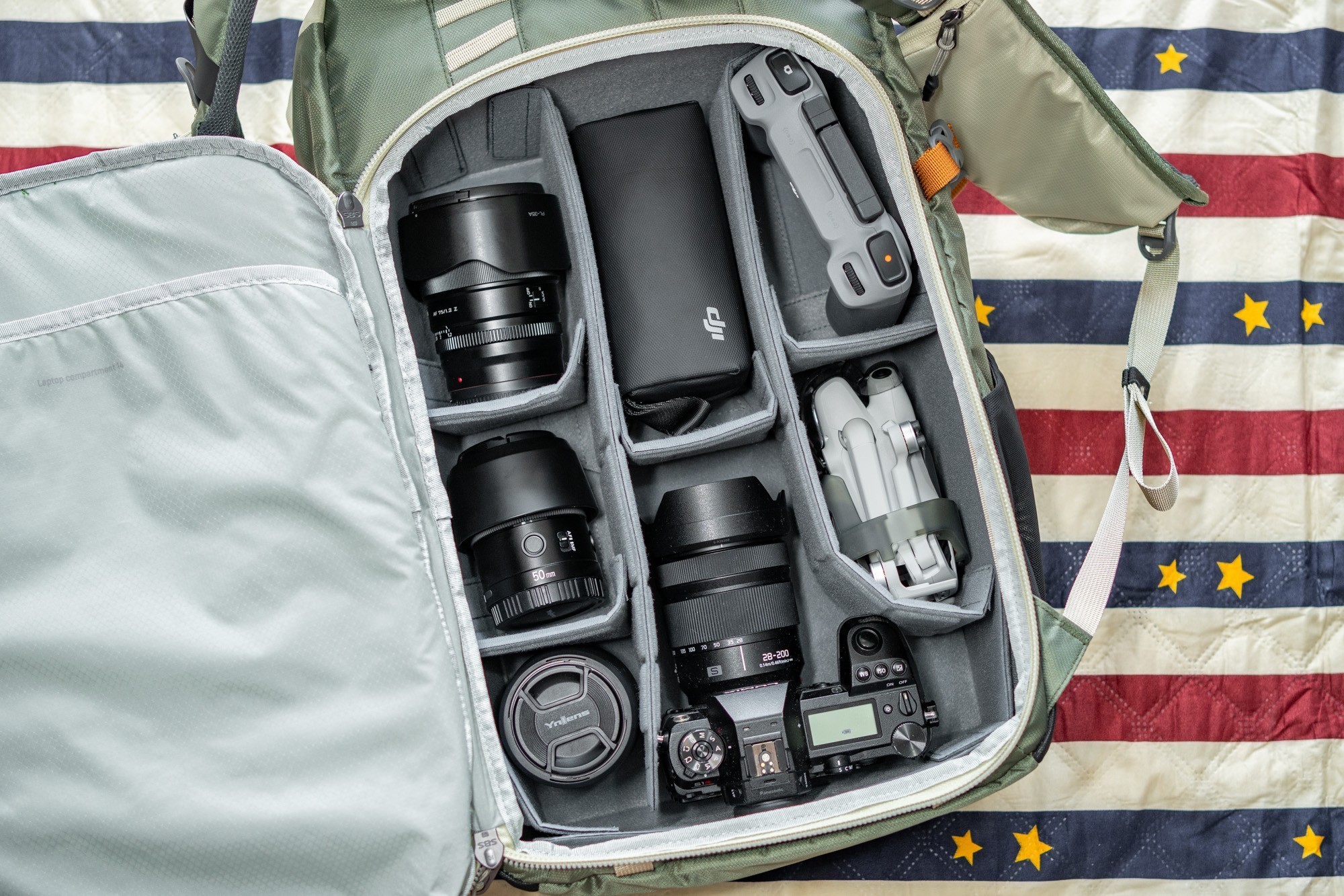 我们评测所用的波奇客户外摄影旅行包是35L容量的版本,因此具备非常强大的装载能力。由于我们日常的工作主要是拍摄,因此摄影包背负最多的物品也就是相机、镜头和无人机等拍摄器材,接着我们就以这些物品为例为大家展示波奇客拾人花摄影包的装载能力。