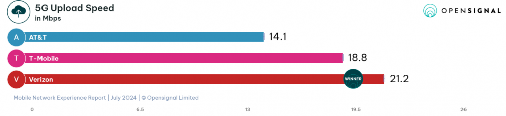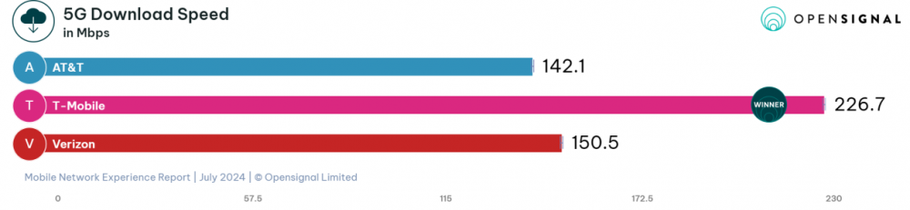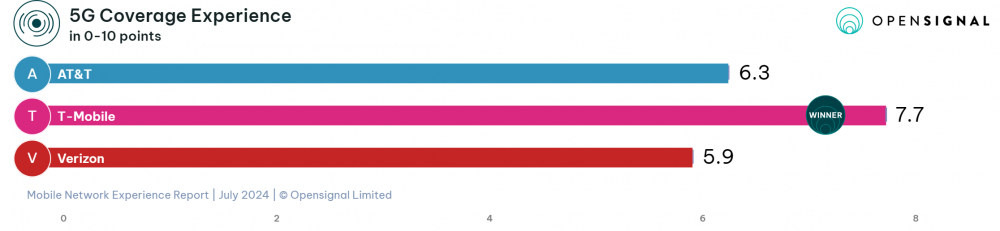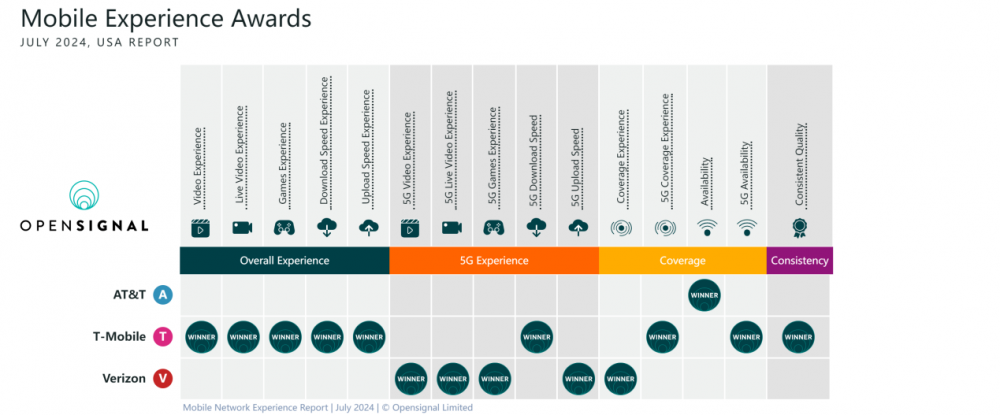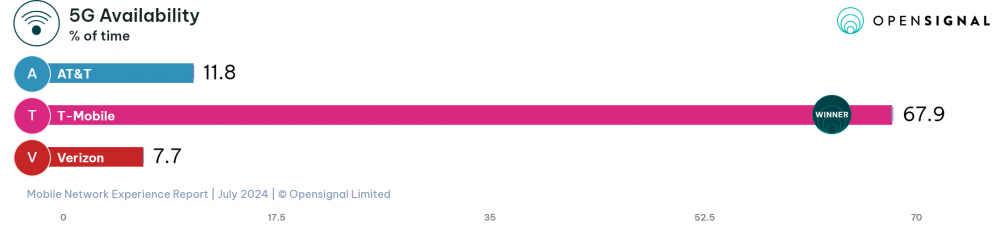 C114讯 7月25日消息(岳明)近日,Opensignal发布了最新《美国移动网络体验报告》。根据对美国三家最大的移动运营商——AT&T、Verizon与T-Mobile从2024 年3月1日至5月29日90天内的移动网络体验的调查发现,几家公司在5G网络表现方面差异显著,尤其在“5G可用性”这一关键指标上,T-Mobile相较于竞争对手可以说是做到了“遥遥领先”。