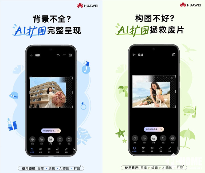 华为方面宣称,AI扩图可智能推荐扩图比例、自然补全照片背景。不但能拯救废片,还能创造趣味大片。