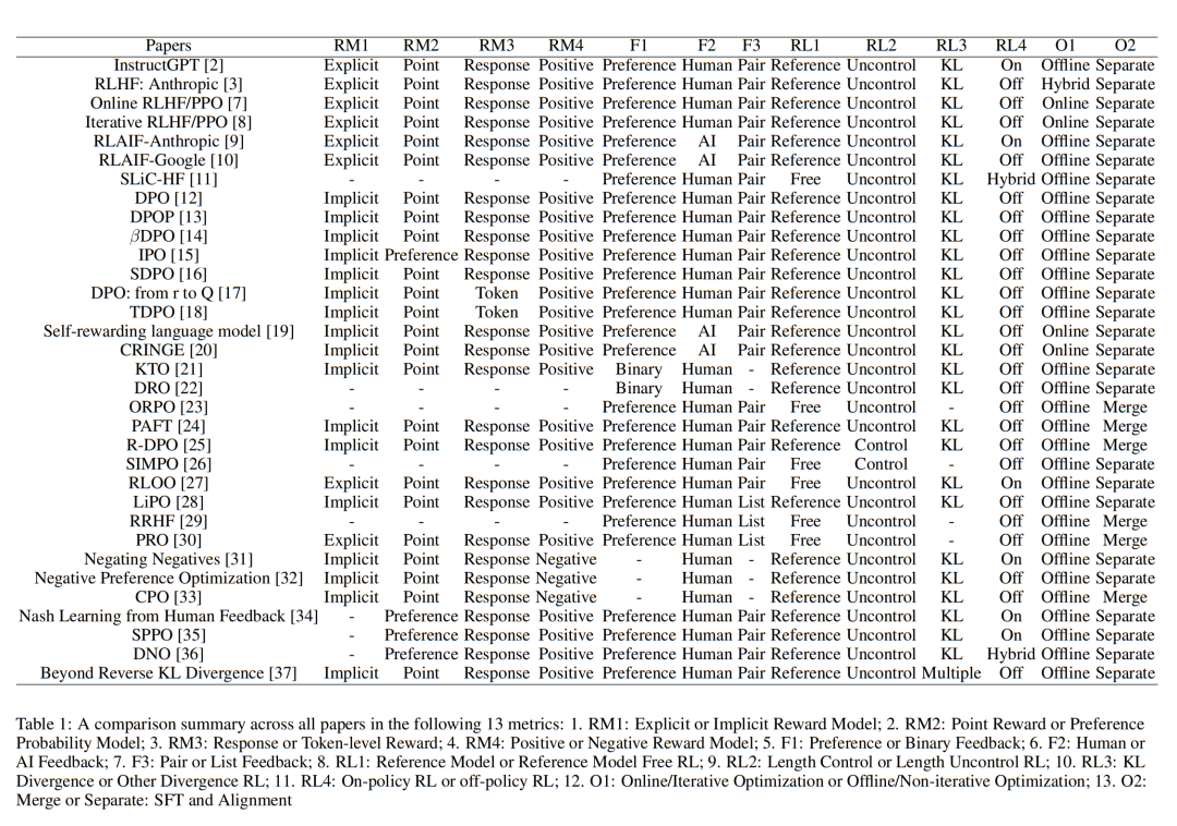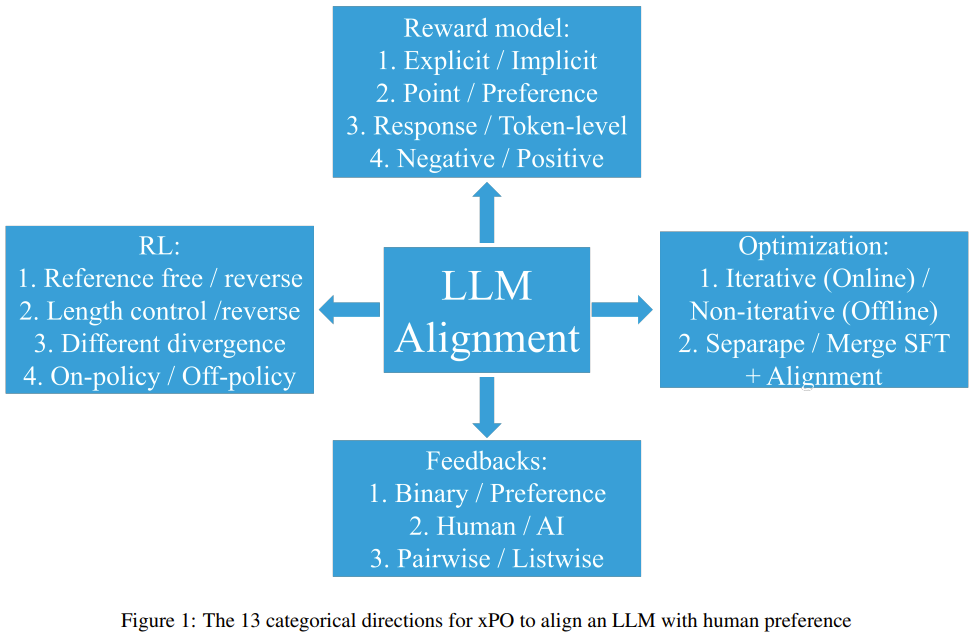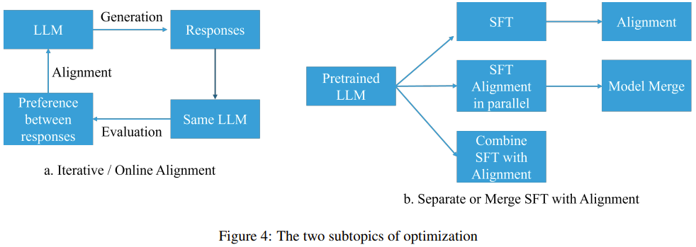 优化的子主题包括:1. 在线 / 迭代式偏好优化与离线 / 非迭代式偏好优化;2. 分离 SFT 和对齐与合并 SFT 和对齐。