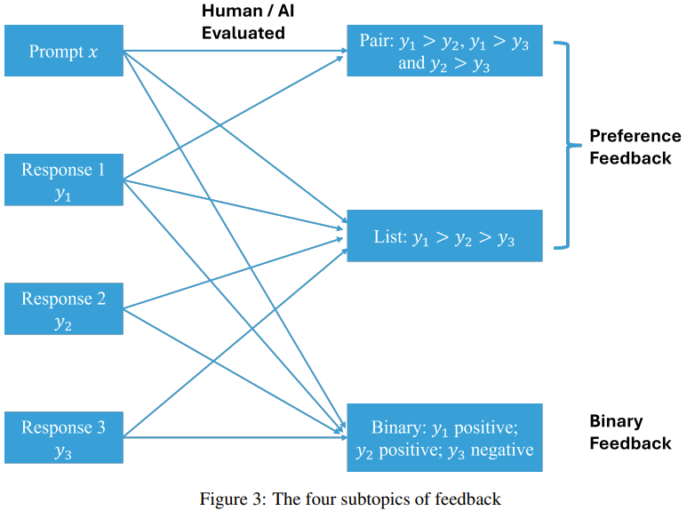 反馈的子主题包括:1. 偏好反馈与二元反馈;2. 成对反馈与列表反馈;3. 人类反馈与 AI 反馈。