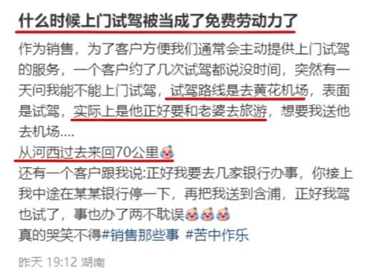多位销售吐槽客户为省打车费白嫖试驾车
