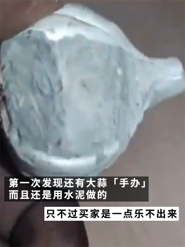结果发现也切不动,最后好不容易让大蒜破防了,结果发现里面是水泥,这下买到真“蒜泥”了。