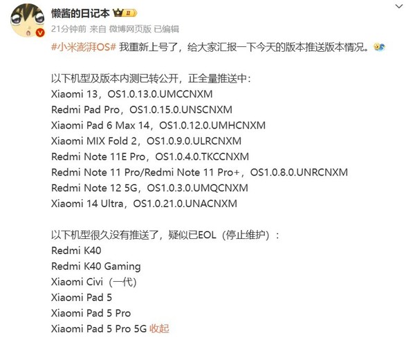 但这些机型已经很久没有推送了,疑似已EOL(停止维护):Redmi K40、Redmi K40游戏增强版、小米Civi(一代)、小米Pad 5和小米Pad 5 Pro(含5G版本)。
