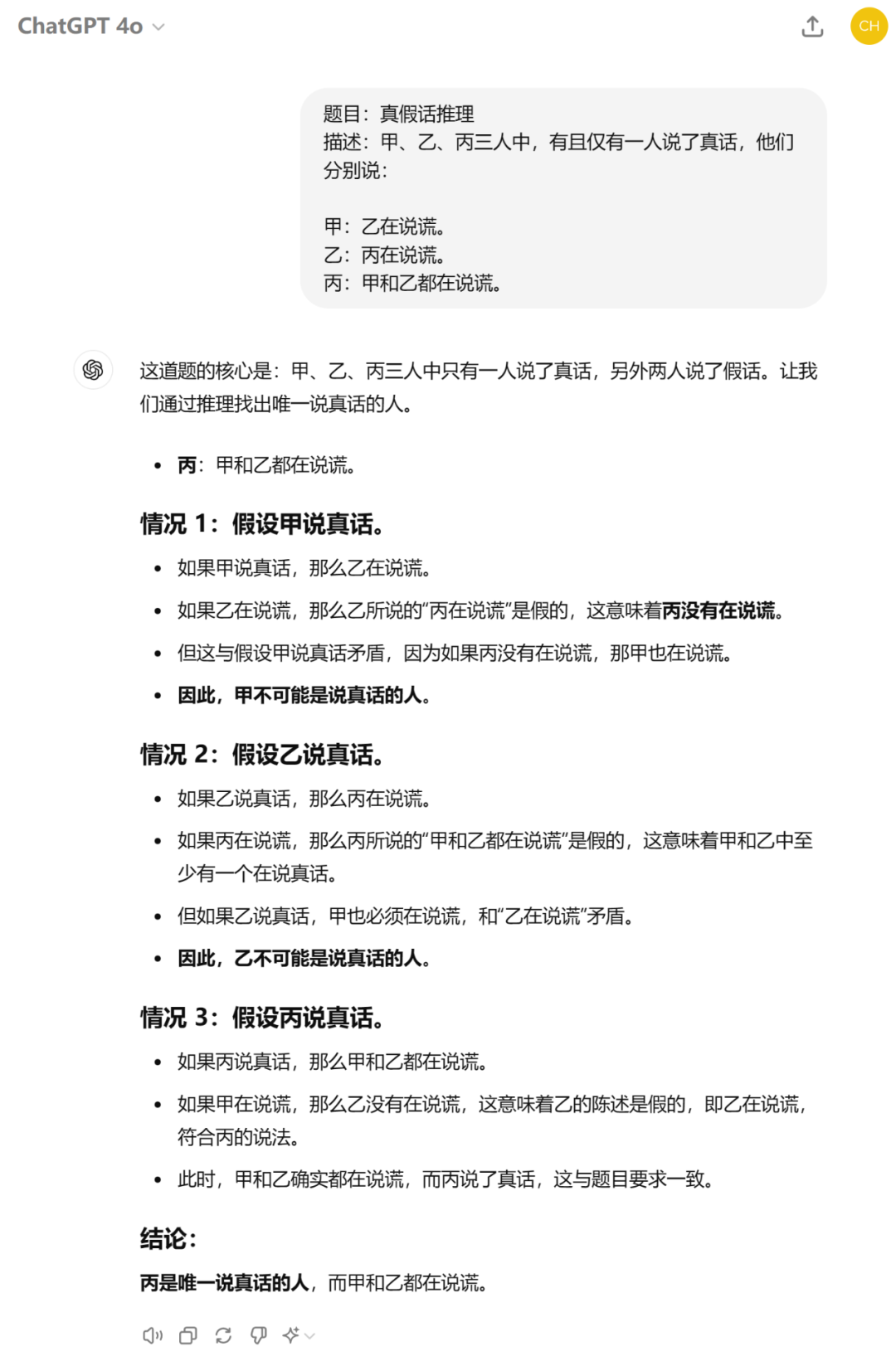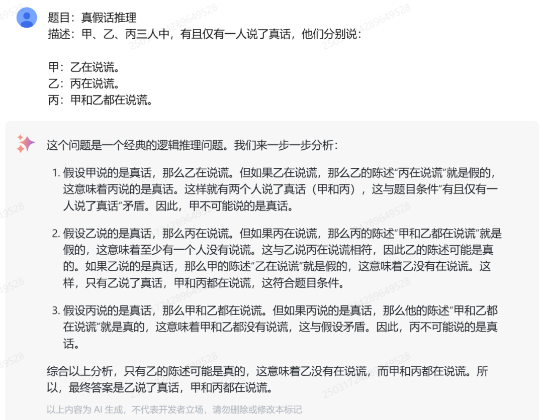 测试 3:对于多人真假话判断问题,GLM-4-Flash 能够理清各种假设情况,并最终给出了正确答案。
