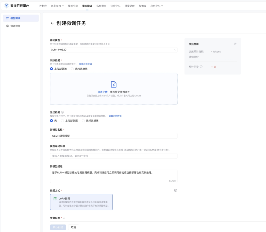 智谱目前已开放了 GLM-4-Flash、GLM-4-9B 等模型的 LoRA 微调和全参数微调能力。在微调的过程中,你需要准备并上传训练数据训练大模型,尝试部署并评估结果,最后完成的模型也可以快速部署。