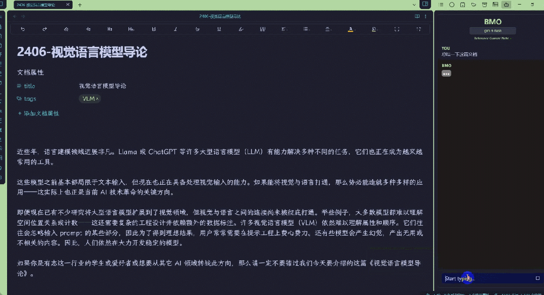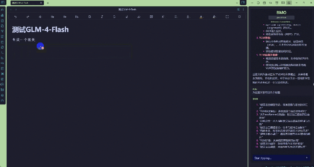 这样你就可以将 GLM-4-Flash 引入到你的笔记工作流程之中,以下展示了部署好的示例,我们让 GLM-4-Flash 分析了一篇有关视觉语言模型的文章并让其建议了一些标题。