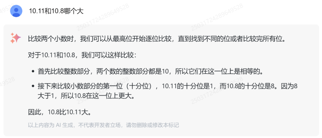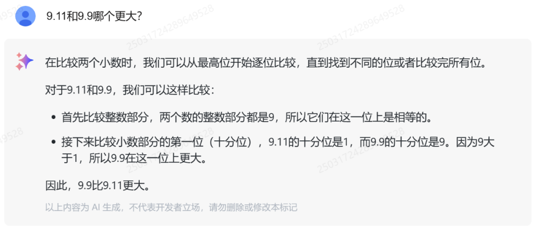 类似的数字比较同样答对了。从解题思路来看,GLM-4-Flash 掌握了正确的小数位比较方法。