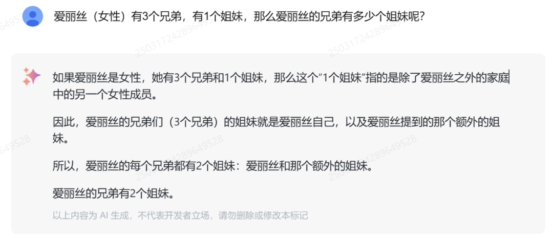 测试 2:此前研究机构 LAION 在一项研究中发现,GPT-3.5/4、Llama、Gemini、Claude 和 Mistral 等大模型回答「爱丽丝(女性)有 N 个兄弟,有 M 个姐妹,那么爱丽丝的兄弟有多少个姐妹呢?」问题时,正确率非常低。