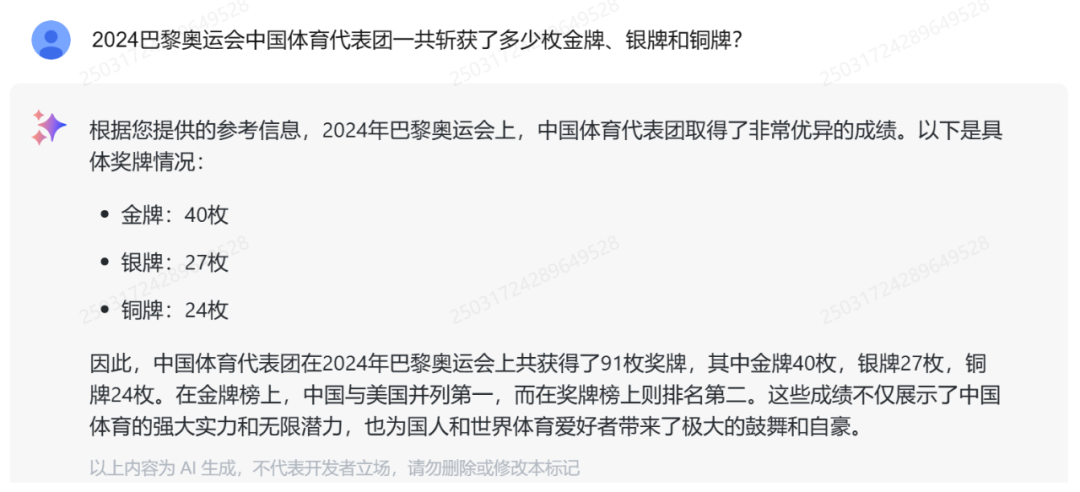 比如 2024 巴黎奥运会中国体育代表团斩获金银铜牌的总数量,结果无误。