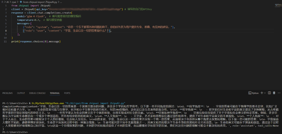 首先,要想调用大模型能力,有最简单的方法:通过 Python 脚本进行体验。智谱的官网上提供了一些示例,只需将其中的 api key 替换成自己的并修改其中的具体内容,就能很方便地使用这个大模型,比如可以在 VS Code 中使用它。