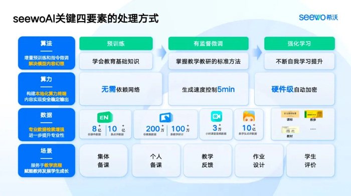 作为教育数字化科技企业,希沃也始终以“集成化、智能化、国际化”的3I为发展指南,不断创新技术,坚持以人为本,开发seewoAI并专注于探索其应用落地。希沃于2023年10月首次发布其教育垂直大模型,并于今年3月通过网信办大模型备案,全力赋能教师教育变革。