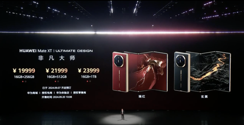 9月10日,华为召开华为见非凡品牌盛典及鸿蒙智行新品发布会,其中华为Mate XT 非凡大师三折叠屏手机正式亮相,也印证了余承东在微博上的发言,“华为最具引领性、创新性、颠覆性的产品来了!这是别人想到但做不到的划时代产品,5 年的坚持与投入,我们将科幻变成了现实。”