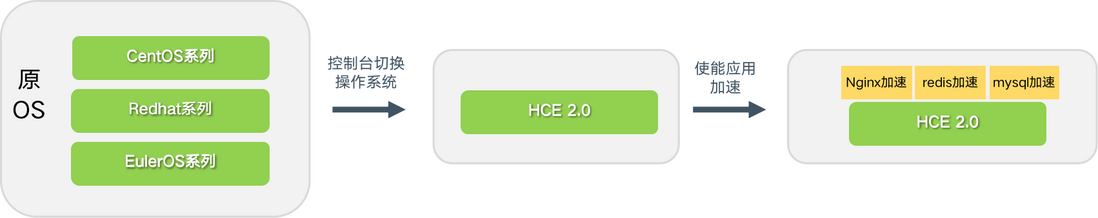仅限Centos系列、Redhat系列以及EulerOS系列。控制台上操作系统类型依然显示原操作系统。原nginx/redis/mysql中数据需要迁移到新软件中。操作步骤: