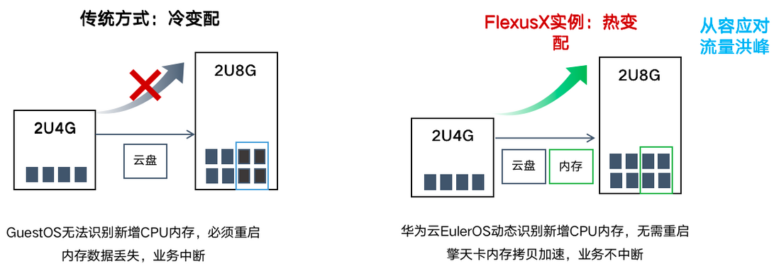 通过上图可以看出,传统方式是冷变配,GuestOS无法识别新增CPU内存,必须重启内存数据丢失,业务中断;而FlexusX实例则是热变配,从容应对流量洪峰,华为云EulerOS动态识别新增CPU内存,无需重启擎天卡内存拷贝加速,业务不中断。同时,FlexusX实例率先在公有云上实现算力热升级,业界主流云厂商唯一支持。