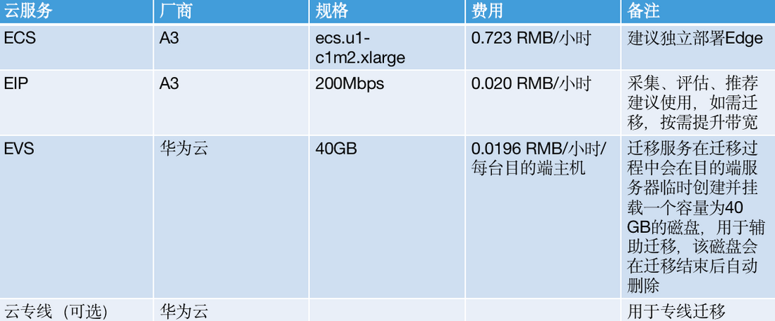 华为云提供了详细的费用估算工具,帮助企业在迁移前了解可能产生的费用。迁移过程中产生的费用明细如下所示: