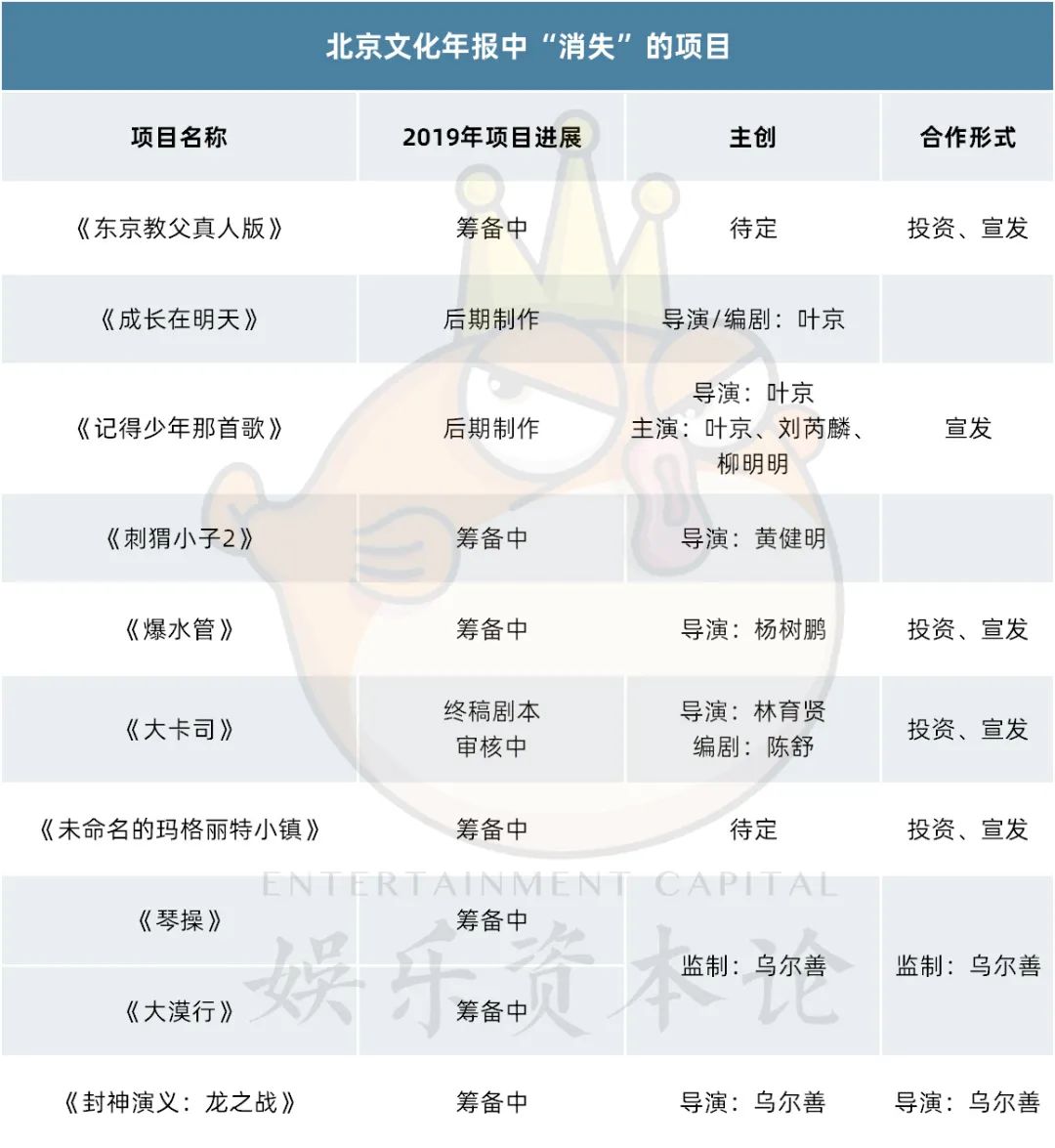 在2019年年报中,乌尔善还有三部作品显示筹备中,之后也“消失”在北京文化后续的年报中。