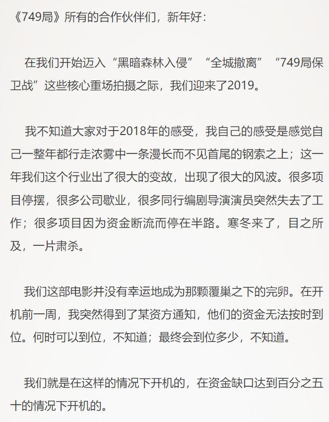 就这样,《749局》在资金缺口50%的情况下开机了。
