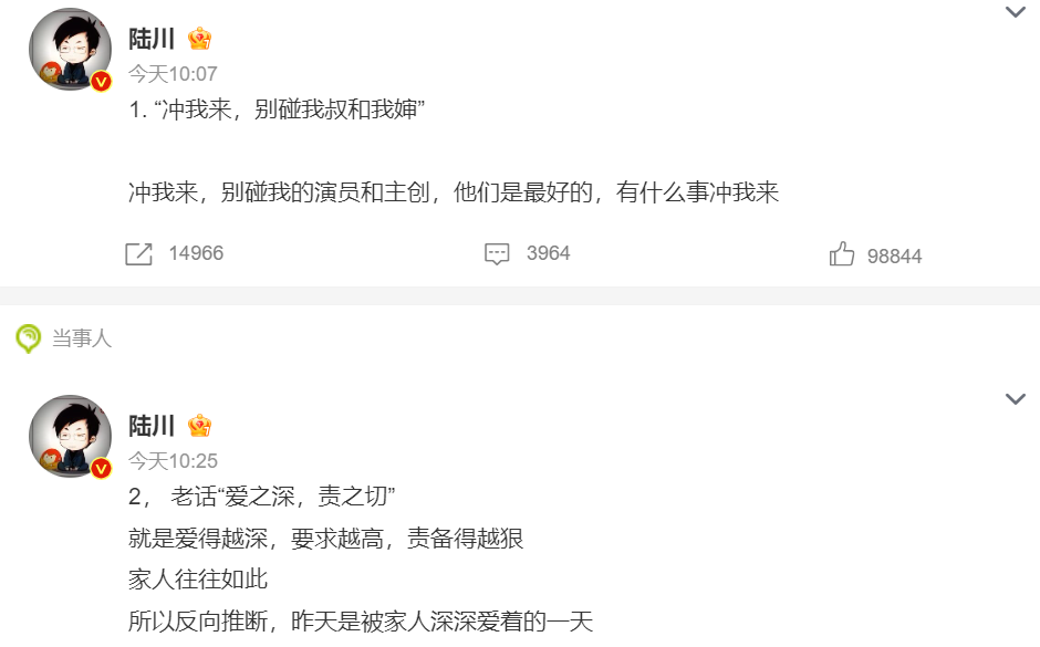 历经一天的差评洗礼后,导演陆川今日上午连发三条微博回应,隔空喊话“有什么事冲我来”,并认为差评都是“家人的爱”。