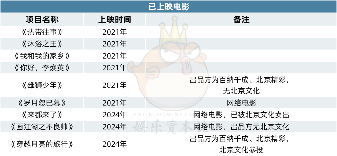 但除了《你好,李焕英》《封神第一部》《沐浴之王》《我和我的家乡》等上映外,大多数都没了着落。2020年年报中,北京文化列出的项目骤降到11部,大量项目“消失”,之后再未出现,其中还不乏已经标注为后期制作的作品。