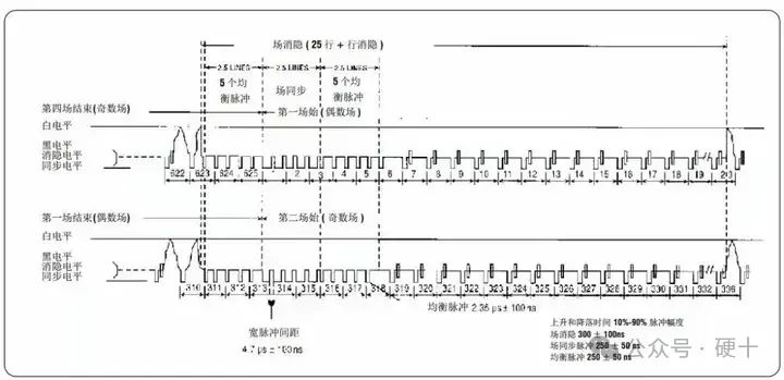 了解了一场扫描的过程之后,我们再看下面隔行扫描中奇、偶场消隐期的信号波形: