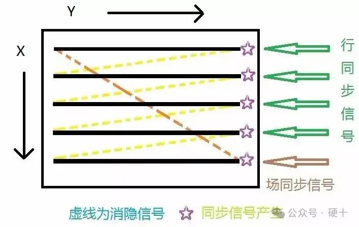 了解一行图像的显示和波形后,再观察行与行以及场与场之间的衔接以及信号特征。下图中黑色线表示一行显示在屏幕上的图像,沿Y轴正方向从左至右的扫描称为行扫描正程;黄色虚线表示扫描正程后,电子枪需要返回到第二行其实扫描位置,这个沿Y轴负方向从右至左的扫描称为行扫描逆程,扫描逆程是不显示画面的,对应行消隐期;橙色虚线表示扫描至一场中最后一行的末尾之后,电子枪需要返回到第一行的起始扫描位置,这个过程称为场扫描逆程,同样这个过程中也是不显示画面的,对应场消隐期。
