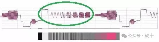 观察这一行信号波形,因为亮度与电平幅度对应,图像中的前段是黑白栅格,所以波形上也对应的是电平高低起伏变化;位于末尾的三段是彩色图像,从信号波形上可以直观的看到色度载波的幅值由小增大,对应图像的饱和度也由小增大,也就是我们常说的“颜色加深”。CVBS信号将亮度和色度信息叠加在一起传输,色度信号由色差信号(R-Y)和(B-Y)对频率处于视频通带高端的副载波调制而形成,使亮度信号的主要能量分布在通带的低端,而色度信号的主要能量分布在高端。