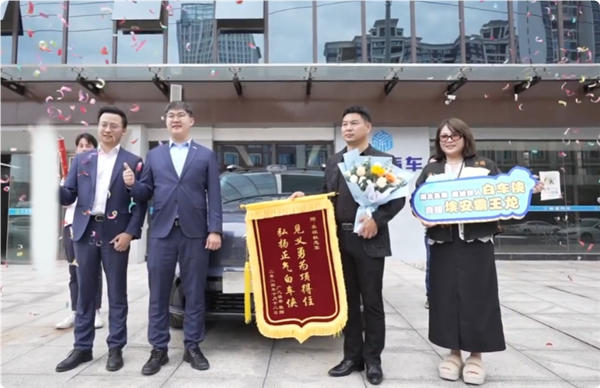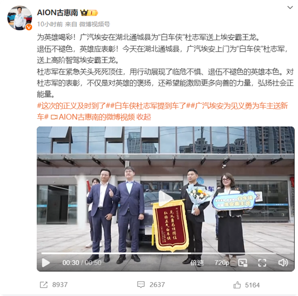 据了解,见义勇为的白色轿车车主杜志军是一名埃安车主,为奖励他见义勇为的举动,广汽埃安日前在湖北通城县上门为杜志军送上高阶智驾埃安霸王龙(全新第二代埃安V)。
