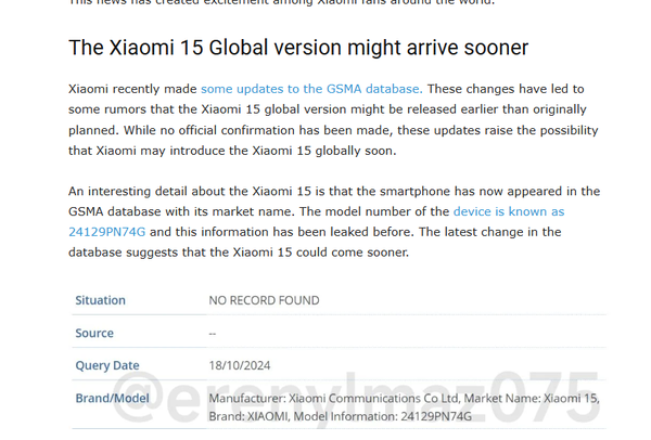据悉,小米近期已经对GSMA数据库进行了一些更新,其中一些变化预告了小米15系列全球发布时间的提前,但目前官方暂未宣布小米15系列的发布时间。按照惯例,小米15系列将率先在中国市场发布,随后才推向全球市场。一般情况下,小米15系列的中国版本和海外版本在配置上不会有明显区别。