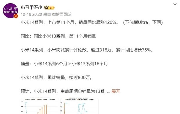传小米14系列累计销量接近800万 同比上代暴增120%