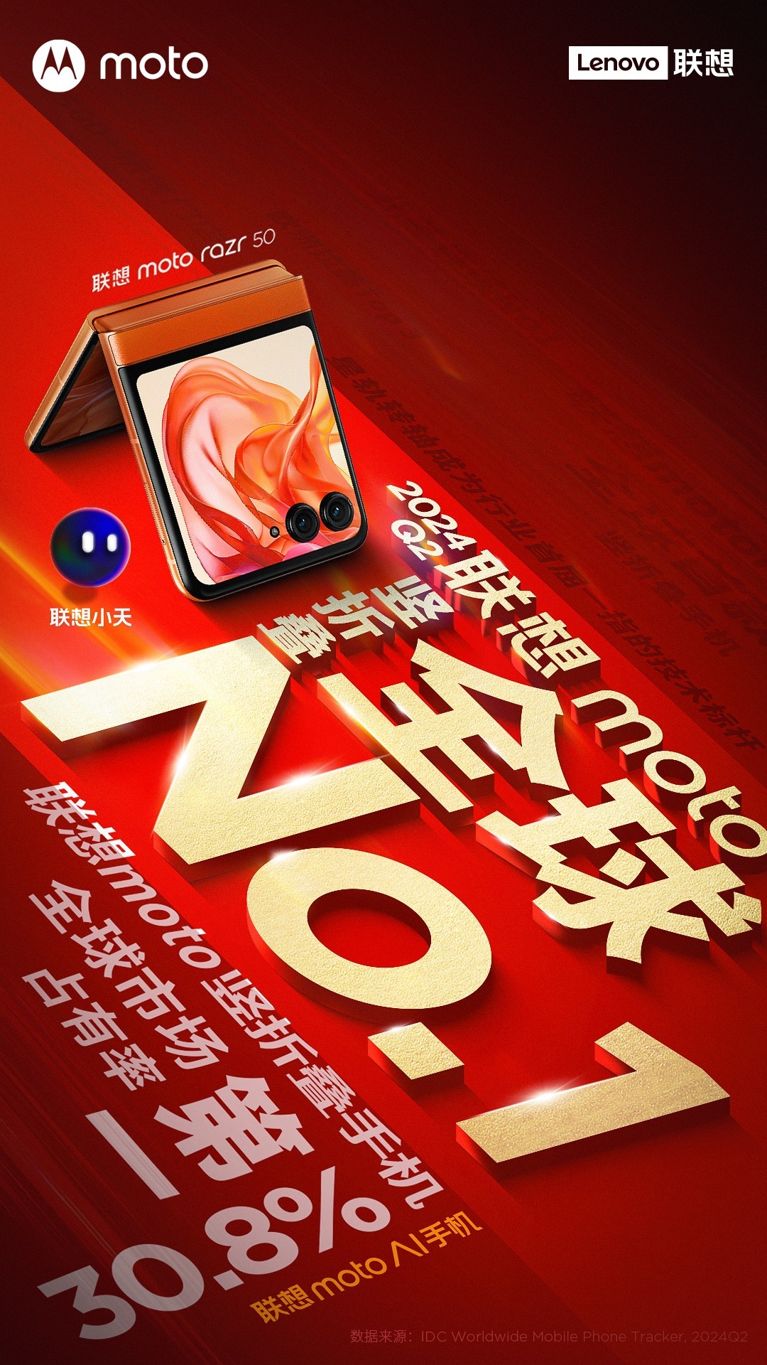 根据最新的IDC 2024年Q2的全球手机数据(IDC Worldwide Mobile Phone Tracker, 2024Q2)显示,联想moto以30.8%的市场占有率,成为竖向折叠屏手机全球市场占有率第一名。