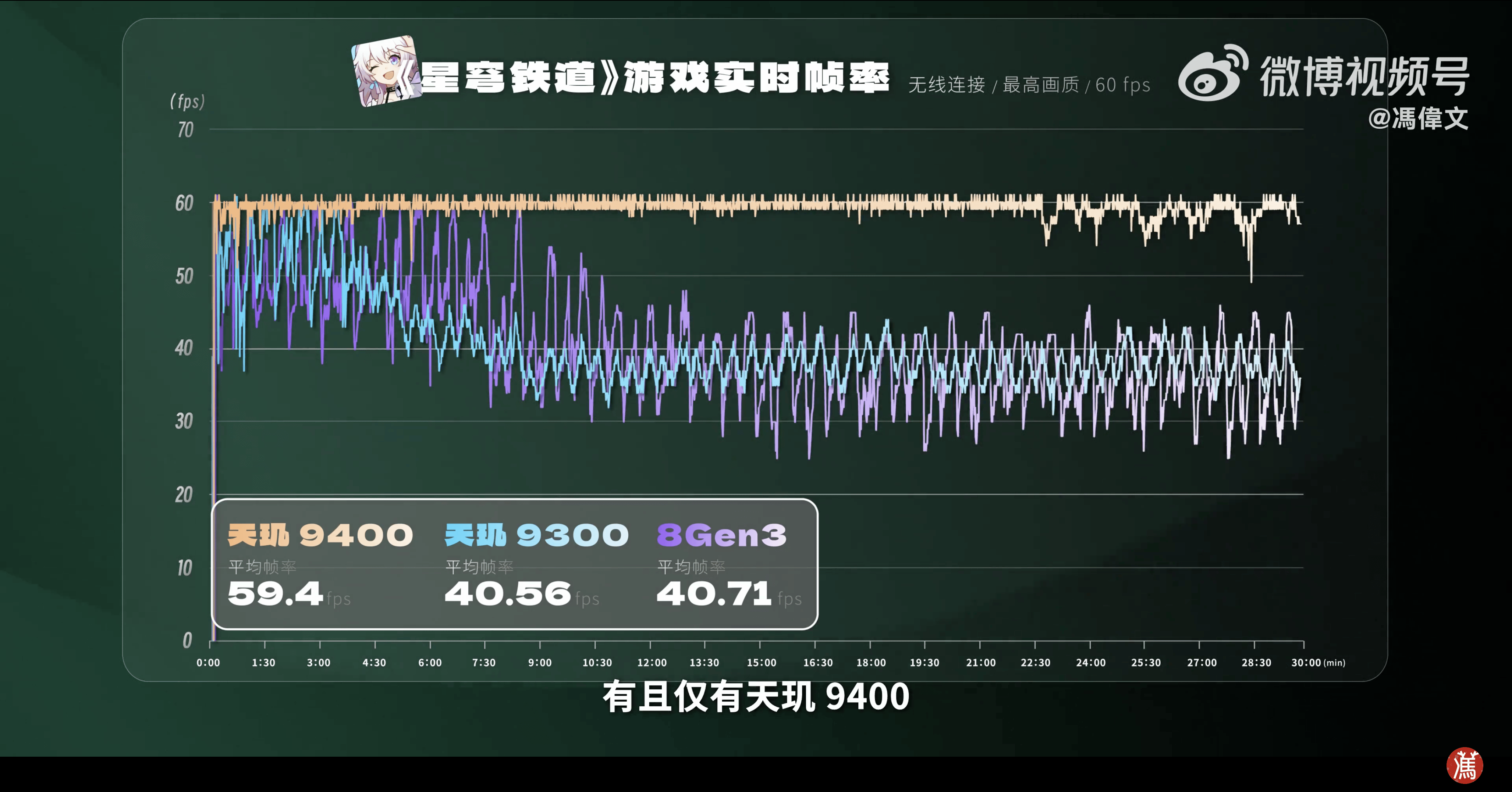 在负载更高的《崩坏:星穹铁道》测试中,天玑9300和8G3平均帧率只有40帧左右,天玑9400直接接近满帧。可以说,天玑9400把这三款重载游戏直接征服了。