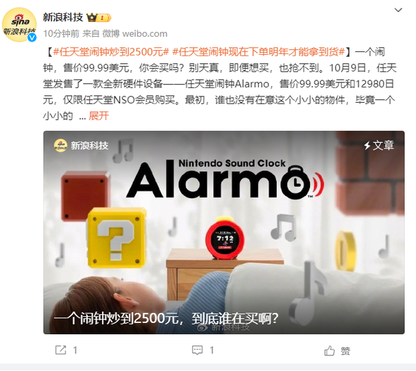 【CNMO科技消息】任天堂近期推出了一款非传统意义上的新硬件——“Alarmo”的电子闹钟。这款闹钟目前仅在美国市场通过Nintendo Switch Online会员抽签方式发售,标价99.99美元。然而,在国内电商及二手交易平台上,Alarmo的价格已被哄抬至约2500元人民币,远超其原价99.99美元(约合人民币711元)。
