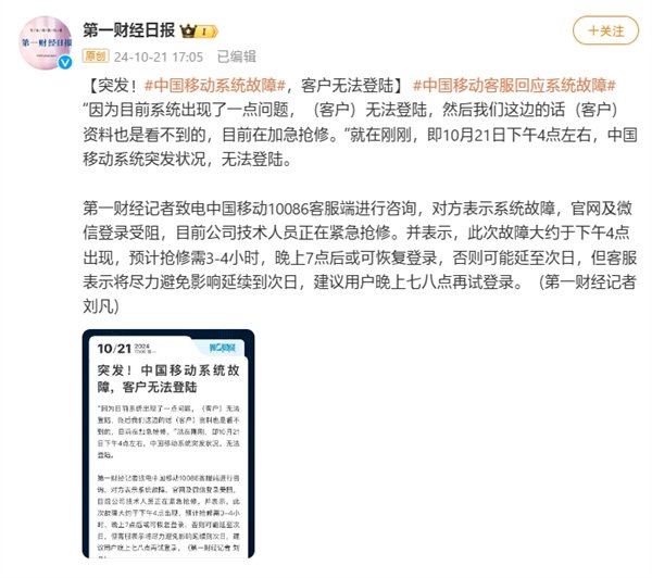 据国内媒体报道,中国移动客服回应称这是系统故障,官网及微信登录受阻,目前公司技术人员正在紧急抢修。