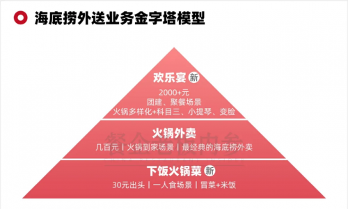 外送业务已经成为海底捞营收第二大业务,除了有下饭火锅菜的创新升级,2023年起海底捞还推出了“定制欢乐宴”,主要是针对商务宴请、生日宴、家宴等推出的定制化宴会服务欢乐宴。欢乐宴、火锅外送、下饭火锅菜,共同组成海底捞外送业务产品的金字塔模型。