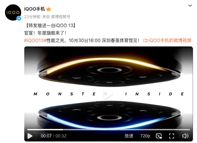 今天,iQOO正式发布iQOO 13外观视频的同时,也正式定档新品发布会将于10月30日举办。