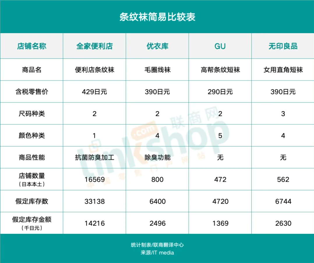 与专业服装连锁店相比,Convenience Wear系列产品的颜色和设计显得较为逊色,商品阵容失去了选择的乐趣。此外,价格和尺码选择也没有优势。就商品的性能表现尚可,算是一大亮点。以热销的条纹袜和纯棉T恤为例,假设在所有店铺铺货,每个SKU平均配置一件,看看全家与其他几大服装品牌的商品基本情况。