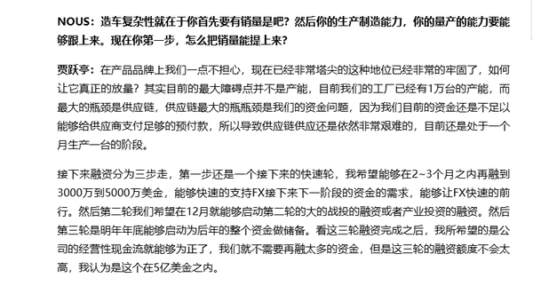 贾跃亭还透露,FF目前正面临资金、供应链和销量等挑战。但他表示,已经制定了详细的融资计划,希望能够在2~3个月之内再融到3000万到5000万美金,并相信通过努力,可以克服这些困难。他透露,FF正在积极寻求美国市场的成功,并计划在未来向全球拓展。
