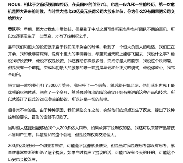 在FF的创业历程中,贾跃亭曾面临恒大的投资和控制权之争。他回忆说,恒大早期对他非常信任,但在中期发生了改变,导致了控制权之争。当时恒大提出给他个人200多亿人民币,以换取FF的控制权,但他毫不犹豫地拒绝了这一提议。他认为,恒大控制了FF,FF就无法成功,因为两者是基因完全不同的公司。尽管这一决定导致FF面临了巨大的困境,但贾跃亭表示并不后悔。