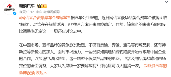 【智车派新闻】根据@新浪汽车 的消息,一家在中国运营的豪华品牌合资车企可能面临解散的命运。目前,关于这家公司的整合最终方案尚未确定,一切还处于讨论阶段,因此未来走向仍存在很大的不确定性。