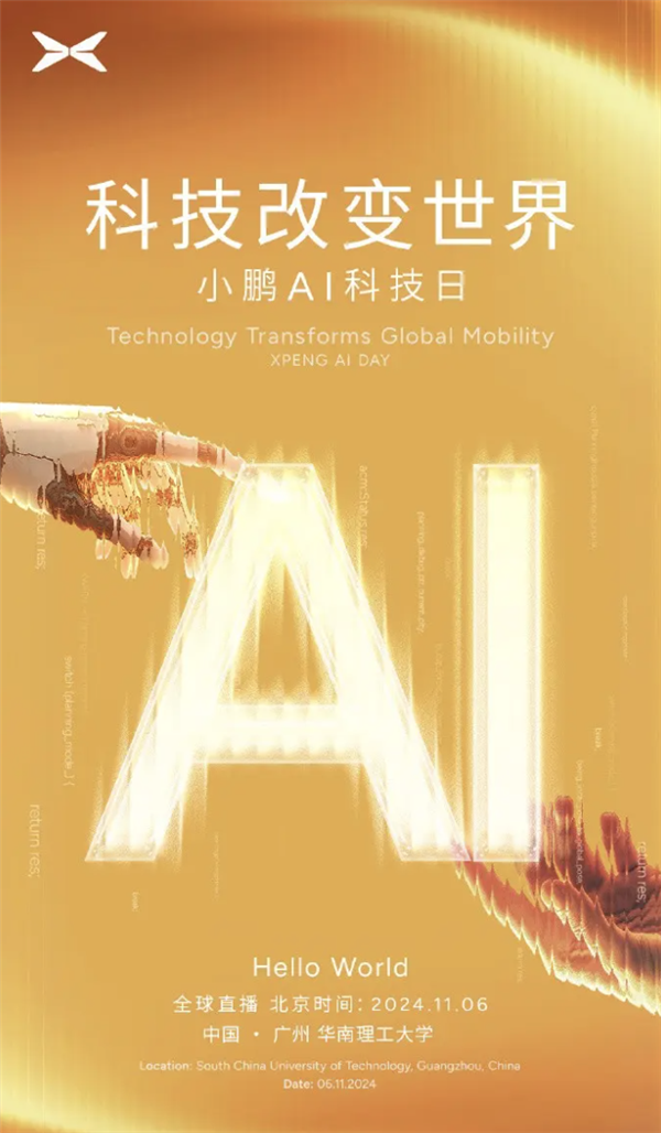 快科技10月24日消息,小鹏汽车即将于11月6日举办“小鹏AI科技日”,届时将分享其在AI汽车、AI机器人和飞行汽车领域的最新进展。